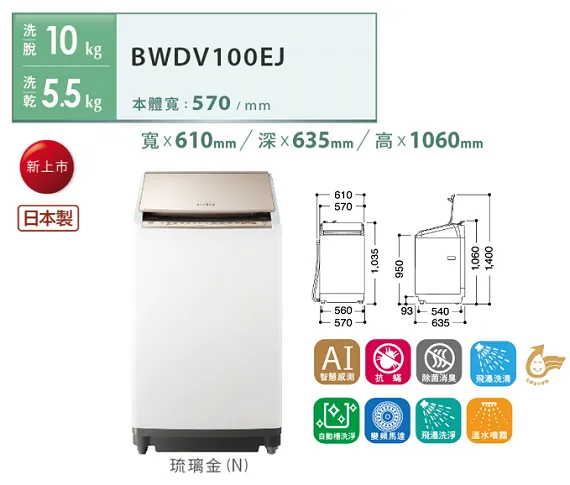 日立HITACHI日本製直立式洗脫烘洗衣機BWDV100EJ