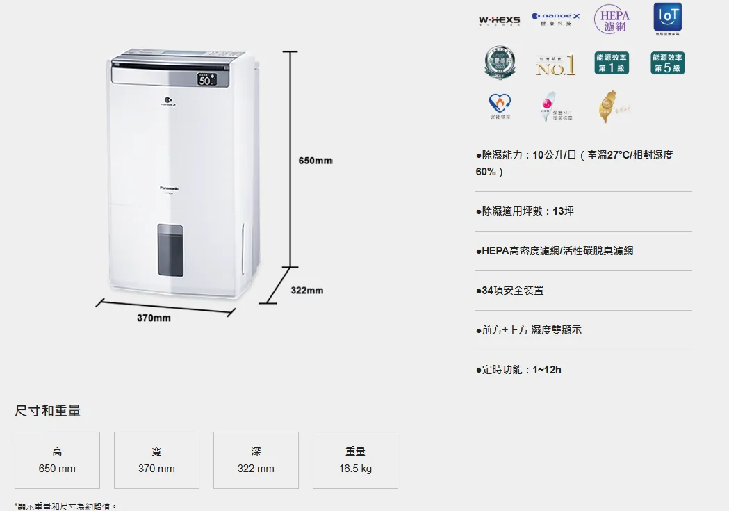 Panasonic除濕機清淨型10公升/日F-Y20JH