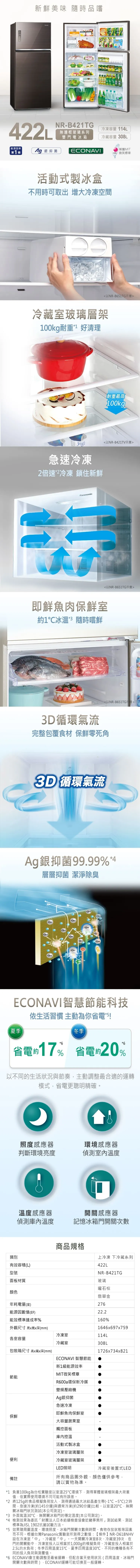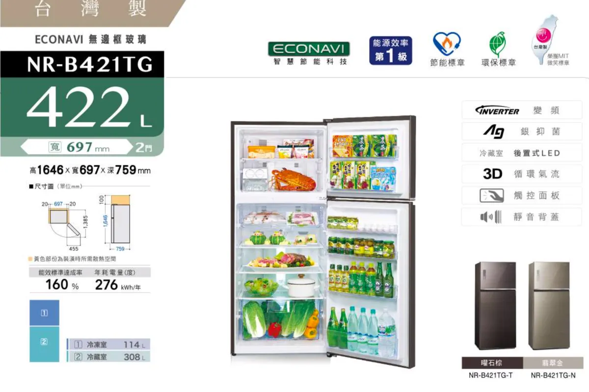 Panasonic 國際無邊框玻璃2門電冰箱 NR-B421TG