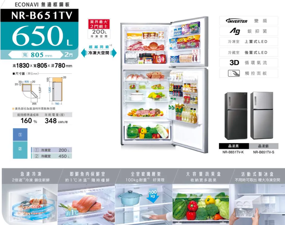 Panasonic 國際無邊框鋼板2門電冰箱 NR-B651TV