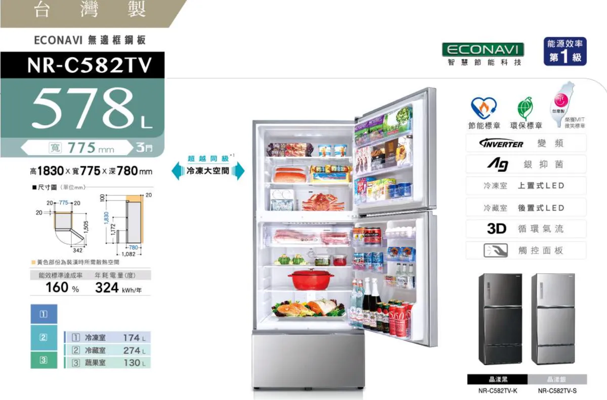 Panasonic 國際無邊框鋼板3門電冰箱 NR-C582TV