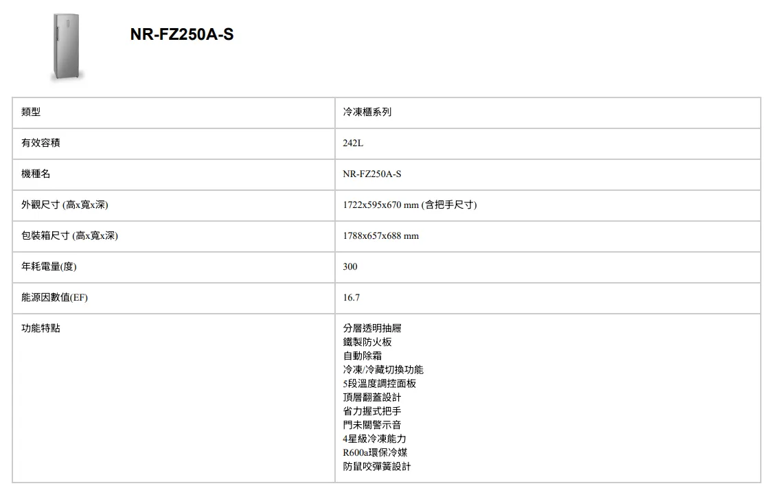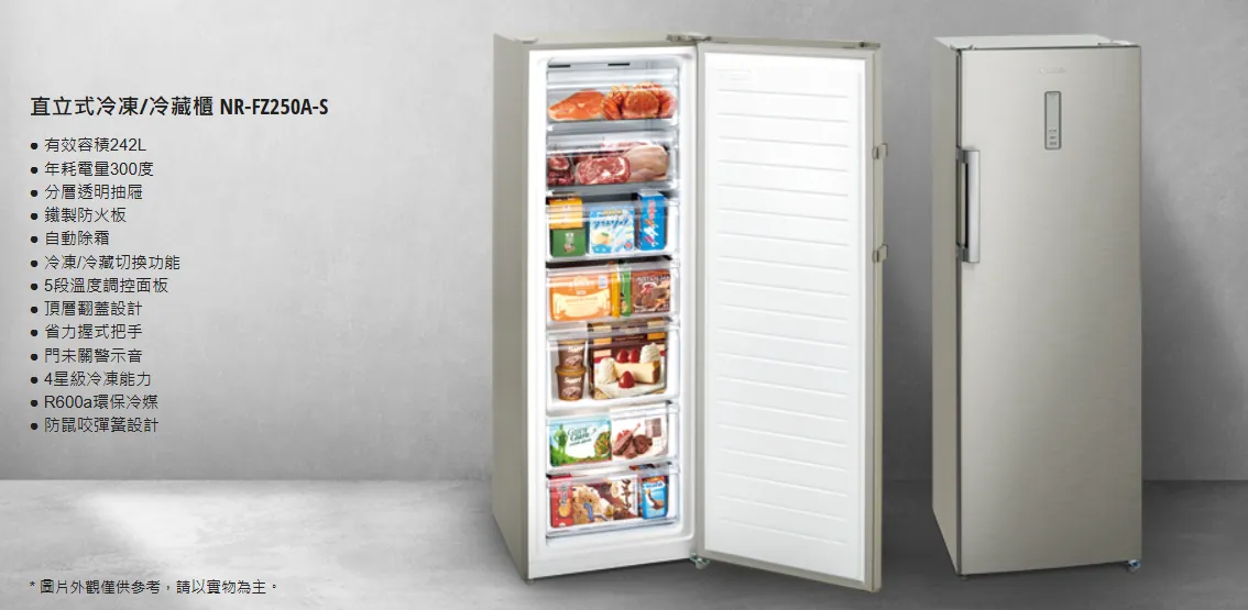 Panasonic 國際直立式冷凍櫃NR-FZ250A-S