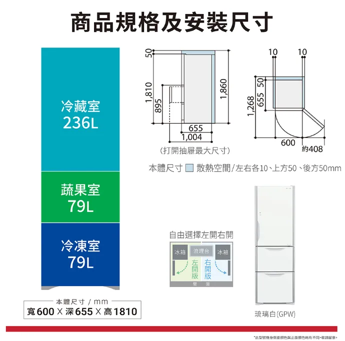 日立HITACHI三門琉璃冰箱 RG41B-394L