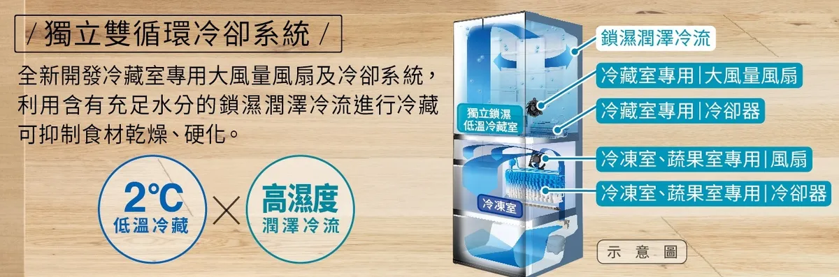 • 獨立鎖濕低溫冷藏室,雙冷卻器雙循環系統