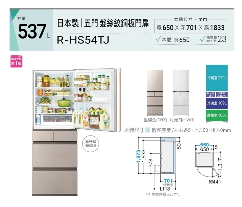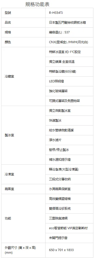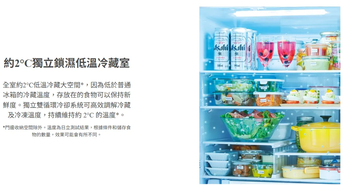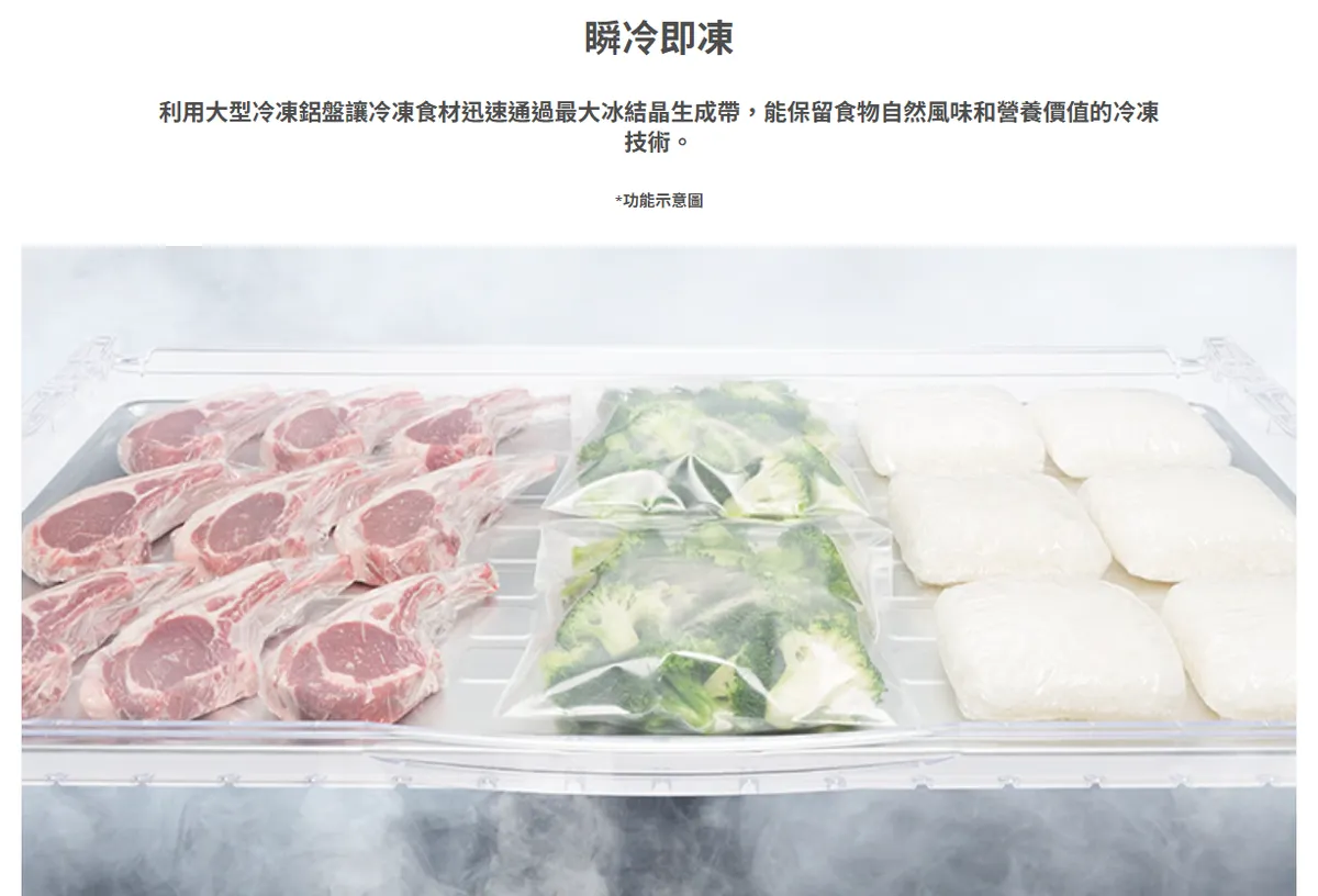 日本原裝髮絲紋鋼板 簡約美型無邊框設計 全室低溫獨立鎖濕 約2℃低溫潤澤冷流 熱食免放涼 溫熱食材直接冷藏 約-1℃特鮮冰溫室 不結凍新鮮保存 大型寬淺急凍鋁盤 一鍵瞬冷 獨立自動製冰室 一鍵按下自動清潔 水潤蔬果保鮮 間接冷卻抑制乾燥 材質進化薄壁內裝 深處的空間也能有效利用